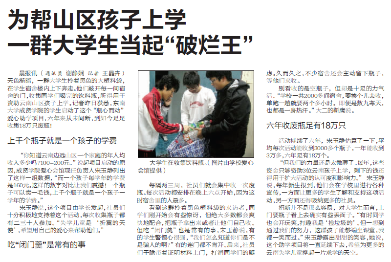 晨报讯(通讯员 谢静娴 记者 王晶卉)天色渐暗,一群大学生拎着黑色的大塑料袋,在学生宿舍楼内上下奔走。他们敲开每一间宿舍的门,收集同学们喝完的饮料瓶,所得用于资助云南山区孩子上学。记者昨日获悉,国产视频 的学生启动了这个“瓶心而动”爱心助学项目,六年来从未间断,到如今足足收集18万只废瓶!