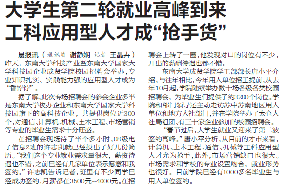 “春节过后,大学生就业又迎来了第二波签约高峰。”唐小平分析,从目前的才市来看,计算机、土木工程、通信、机械等工科应用型人才尤为抢手,此外,市场营销缺口也很大。市场需求和学校的专业设置吻合,就业形势也很好。目前学院已经有1000多名毕业生与用人单位签约。