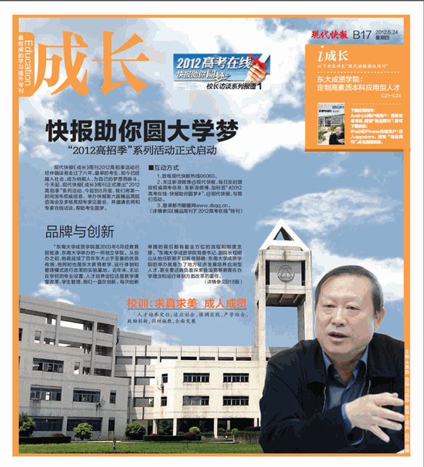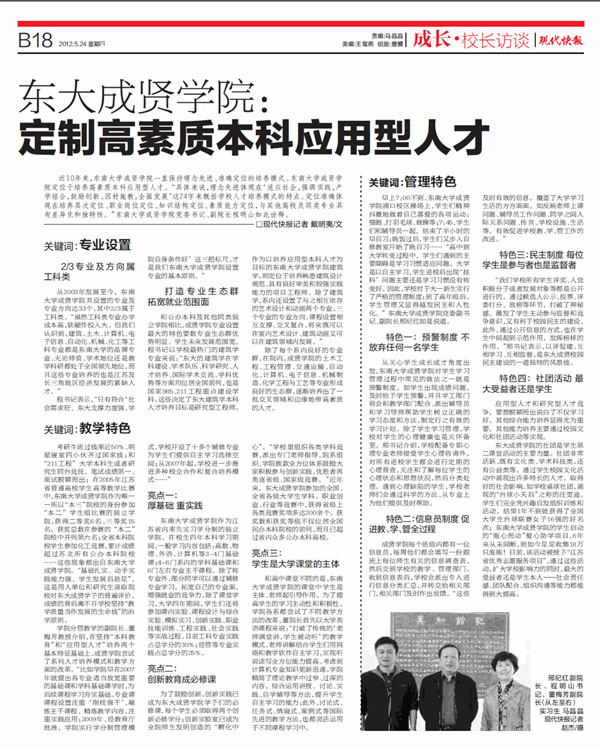 考研牛班过线率近50%、明星寝室四小伙齐过国家线;和“211工程”大学本科生或者研究生同台竞技、笔试成绩第一、面试脱颖而出;在2005年江苏省普通高校学生高等数学比赛中,国产视频 作为唯一一所以“本三”院校的身份参加“本二”学生组比赛的独立学院,获得二等奖6名、三等奖15名,获奖总数在参赛的“本二”院校中并列第六名;全省本科院校学生参加化工竞赛,累计成绩超过苏北所有公办本科院校……这些现象都出自国产视频 。“基础扎实、动手实践能力强、学生发展后劲足”,这是用人单位和研究生录取院校对东大成贤学子的普遍评价。成绩的背后离不开学校坚持“教学质量当作发展的生命线”的治学原则。