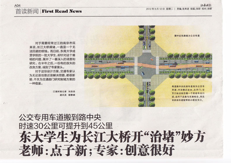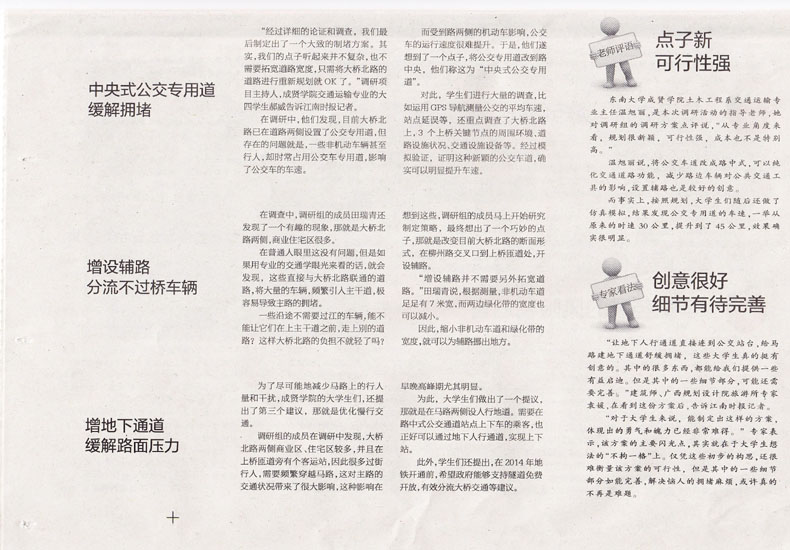 “经过详细的论证和调查,我们最后制定出了一个大致的制堵方案。其实,我们的点子听起来并不复杂,也不需要拓宽道路宽度,只需将大桥北路的道路进行重新规划就OK了。”调研项目主持人,国产视频 交通运输专业的大四学生郝威告诉江南时报记者。