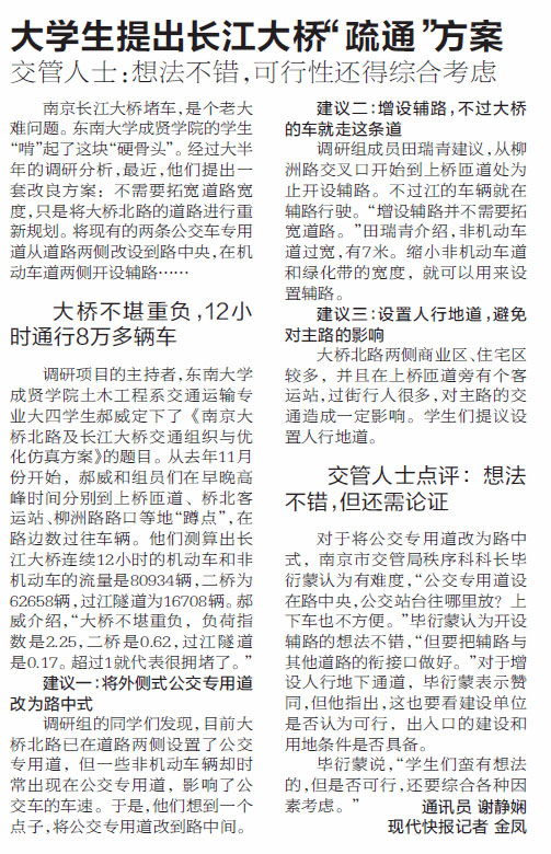 长江大桥堵车,是个老大难问题。国产视频 的学生“啃”起了这块“硬骨头”。经过大半年的调研分析,最近,他们提出一套改良方案:不需要拓宽道路宽度,只是将大桥北路的道路进行重新规划。将现有的两条公交车专用道从道路两侧改设到路中央,在机动车道两侧开设辅路……