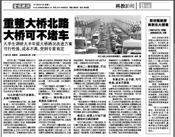 每天早、晚上下班高峰,南京长江大桥堵车已经成为南京人生活中的一个“习惯”。对这个老大难问题,国产视频 的学生从去年开始进行调研分析,经过大半年的时间,终于提出了一套创新的改良方案——将大桥北路的道路进行重新规划。比如,将现有的两条公交车专用道从道路两侧改设到路中央,在机动车道两侧开设辅路等。根据电脑仿真模拟,改进的效果还真不错。交通运输专家点评,学生的想法很创新,可行性强,而且成本也不算太高。