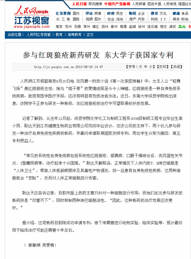 【人民网】参与红斑狼疮新药研发 东大学子获国家专利