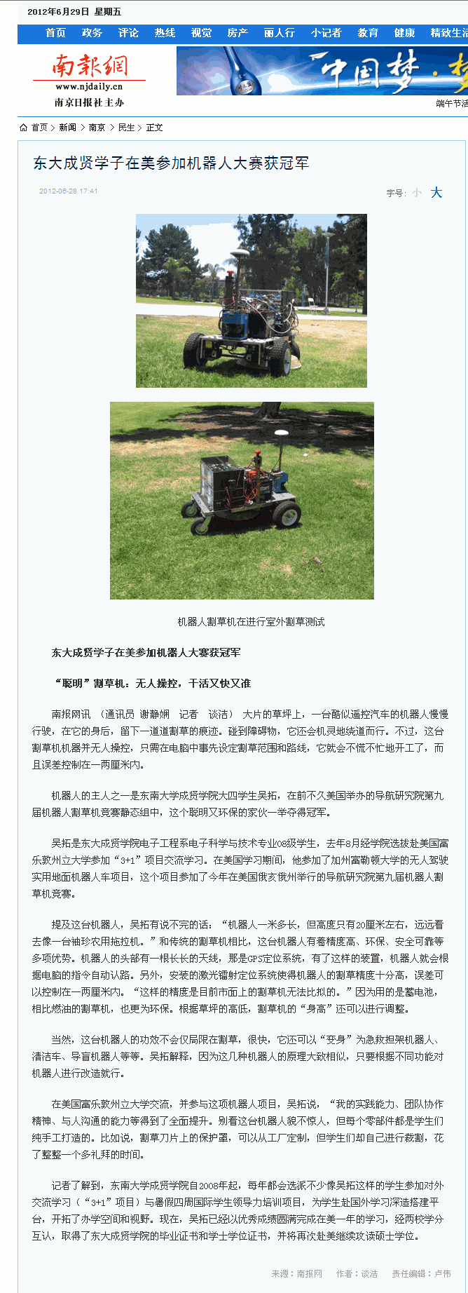 【南报网】东大成贤学子在美参加机器人大赛获冠军
