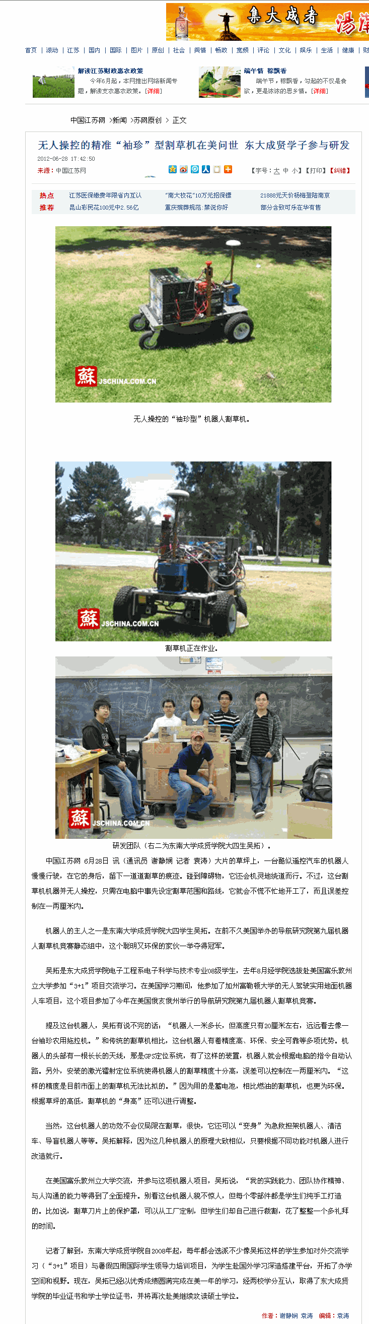 【中国江苏网】无人操控的精准“袖珍”型割草机在美问世 东大成贤学子参与研发
