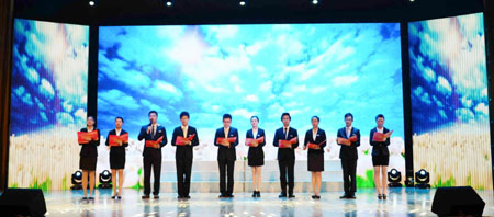 庆典大会在新颖、动感的彩旗方阵表演《精彩从这里起航》中拉开序幕。