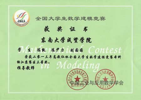 第22届全国数学建模竞赛公布比赛中,2011级朱向洋、俞梦丹、崔越喜获全国二等奖,陈凯、陈尹力、刘园园荣获省三等奖,在同类院校中名列前茅。