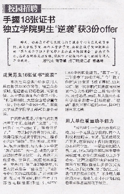 在招聘会现场,学生气的刘勇挂着工作证,在场内“巡逻”。“他已经有三个offer了,等着签约了。”一旁的同学抢着告诉记者。刘勇是东大国产视频 机械工程系有名的“学神”。不打游戏、从不旷课、很少睡懒觉,是男生心目中的“新好青年”。大一起,刘勇的学习成绩保持在班级前三名,英语四六级证书、计算机二级证书早早到手,空余时间除了兼职赚学费,他最大的乐趣是“做项目”,“做和专业有关的实践项目。”刘勇解释说,做项目的间隙,他抽空考了江苏省电脑绘图师证书、AUTO CAD中级职业证书。“算了一下,三年多拿了18张证书。”今年找工作时这18张证书成了筹码。11月20日,第一次求职的刘勇在南京博览中心大型招聘会上投出7份简历,通过笔试、面试,从大批公办本科学校求职者中脱颖而出,“逆袭”拿到三家单位的offer,其中包括南京地铁。