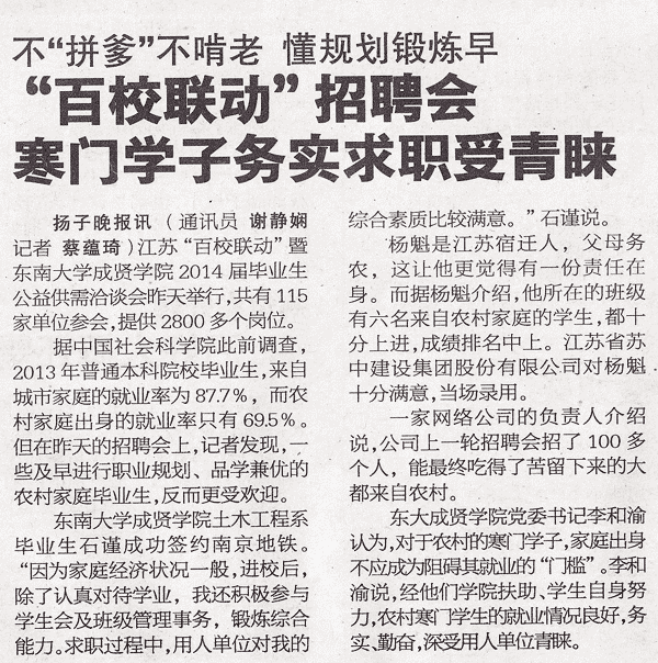 【扬子晚报】百校联动招聘会 寒门学子务实求职受青睐
