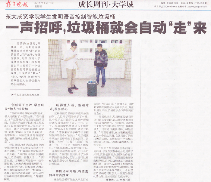 【扬子晚报】东大国产视频 学生发明语音控制智能垃圾桶
