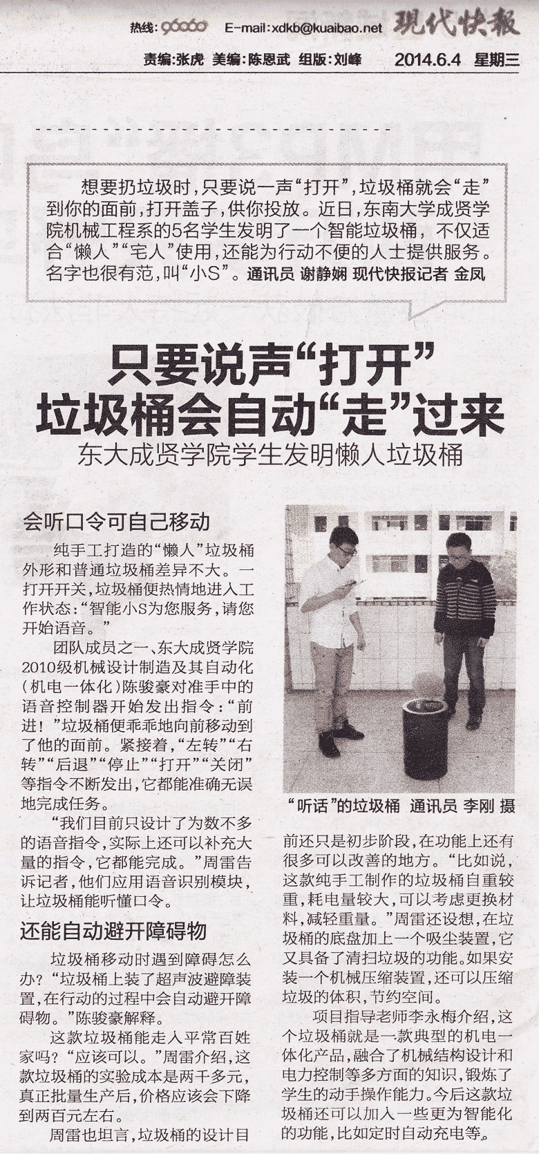 【现代快报】只要说声“打开”,垃圾桶就会自动“走”过来