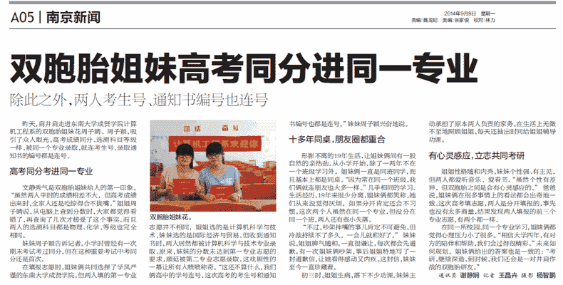 【南京晨报】双胞胎姐妹高考同分进同一专业