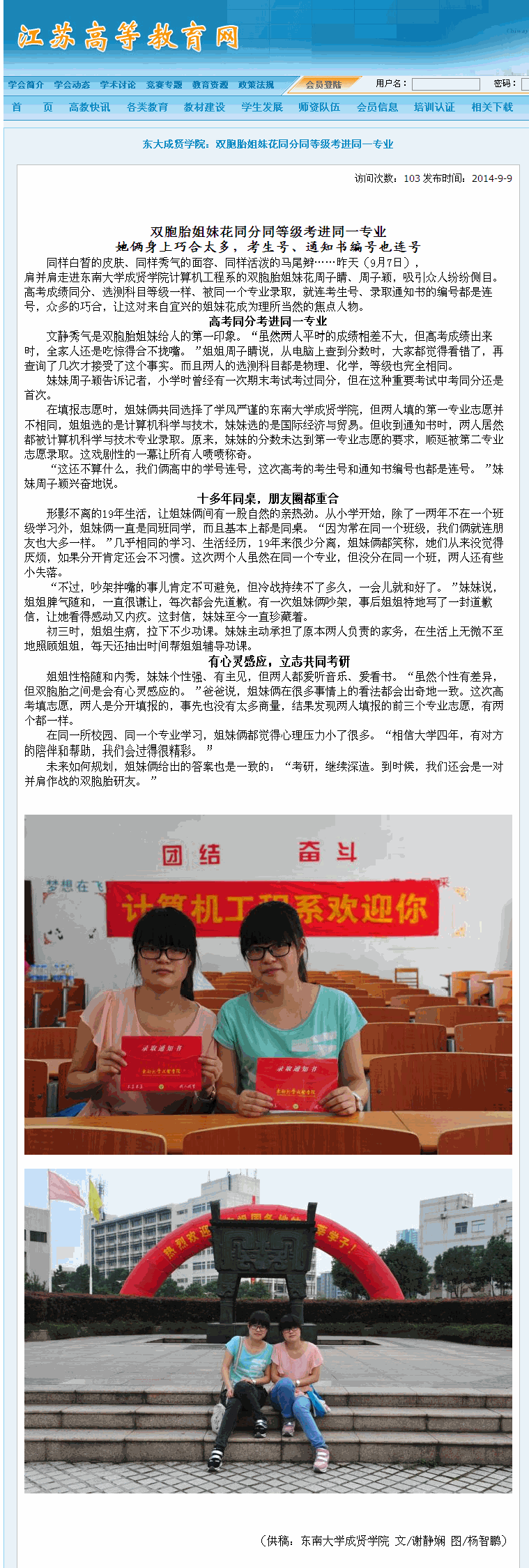 【江苏高等教育网】东大国产视频 :双胞胎姐妹花同分同等级考进同一专业