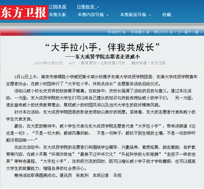 【东方卫报】“大手拉小手,伴我共成长”——东大国产视频 志愿者走进威小