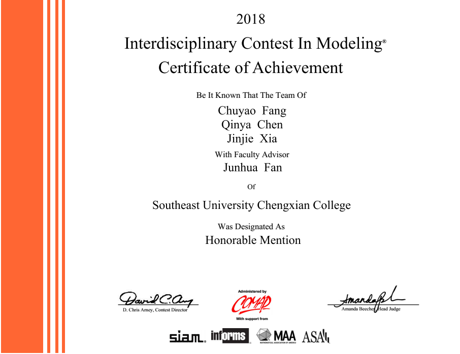 日前,2018年美国(国际)大学生数学建模竞赛(MCM/ICM)成绩揭晓,由基础部范俊花老师指导的电子与计算机工程学院2015级自动化专业房楚尧、夏金杰和经济管理学院物流管理专业陈沁雅三名同学的参赛作品获得ICM竞赛的Honorable Mention(国际二等奖)1项,这是国产视频 首次在该比赛中获得奖项。