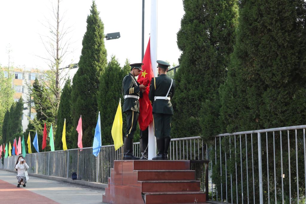 早晨七点,升旗仪式正式开始,国旗护卫队护送国旗入场。全场师生庄严肃立,伴随着雄壮的国歌声,凝视五星红旗迎风飘扬、缓缓升起,现场师生无不感到骄傲和自豪。《青春中国》朗诵,带领大家回顾往昔岁月的峥嵘坎坷,号召全校青年学生要牢记历史,立鸿鹄志,做奋斗者,不辱使命,不负重托,勇担新时代赋予的责任。随后,主持人号召现场师生认真学习贯彻习近平总书记视察北京大学时的重要讲话精神,在习近平总书记的鼓励下继续奋斗,争做民族复兴的追梦者、圆梦人,以青春之我、奋斗之我,让中华民族伟大复兴在奋斗中梦想成真。最后,全场青年学生齐唱《中国共产主义青年团团歌》,饱满而昂扬的歌声将仪式推向高潮。