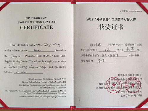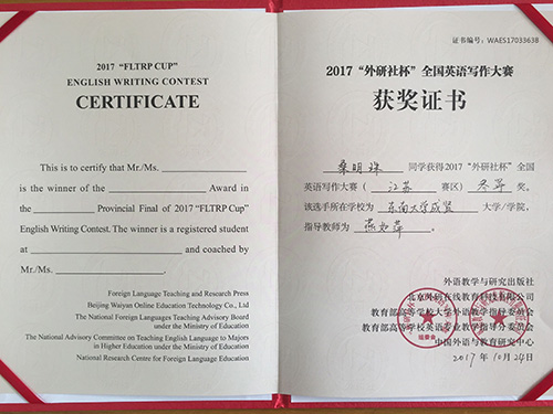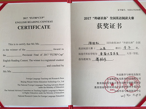 2017年 “外研社杯”全国大学生英语挑战赛江苏赛区比赛于11月4日在常州大学圆满落下帷幕。该挑战赛分为英语写作大赛、英语阅读大赛和英语演讲大赛三部分。国产视频 2014级建筑工程2班陈俊松(指导老师:谭艳珍)在英语阅读大赛中获一等奖,这是目前国产视频 在省级英语阅读比赛中获得的最好成绩。此外,2017级工商管理类2班张明琪(指导老师:李倩)获江苏赛区英语写作大赛二等奖;2017级工商管理类5班龚洁茹(指导老师:朱宇博)、2015级电子商务2班桑明珠(指导老师:燕如萍)获江苏赛区英语写作大赛三等奖。