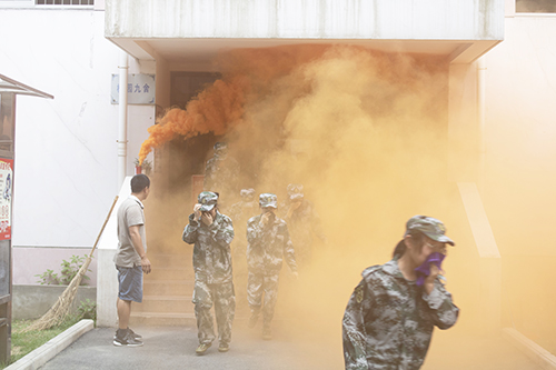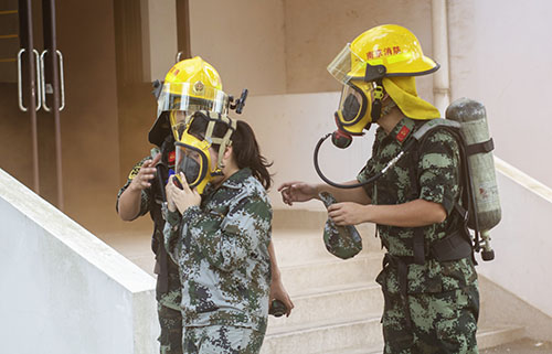 随后的疏散演练现场,学生在宿舍楼突然发生“火灾”的情况下,按第一时间赶赴现场的引导员的指引方向,有序地疏散至室外平台区域。在清点人员后,消防员模拟进入建筑物营救被困人员,最终全部人员安全疏散完毕,整场活动井然有序。
