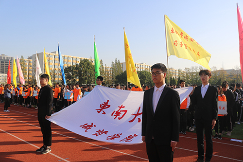 参赛代表队在运动会进行曲中迈着整齐的步伐依次入场。徐悦书记首先致辞,代表学校党政领导向参加本届运动会的全体师生表示诚挚的问候,并对本次运动会提出希望和要求。随后选出体育运动活动中表现突出的运动员作为“十佳运动员”进行表彰,他们分别是刘梓恒、唐红、范志辉、刘永沛、章宸瑄、郑颍、盛泽成、岳涛、李宛林、杨婷;对在2018年江苏省大学生校园篮球联赛(独立学院组)比赛中获得冠军队伍代表进行表彰,他们分别是岳涛、吴雨聪、余盛强、路志鑫、盛泽成、冯帆;对被评选为学校“体育工作积极分子”的六名教师进行表彰,他们分别是冯杭州、庄桂山、李洪全、肖佩琮、朱龙舜、李皓。随后15级汽车2班吴肇章同学与体育部徐小虎老师分别代表运动员和裁判员郑重宣誓。最后由国产视频 体育系王强书记宣布运动会开幕。