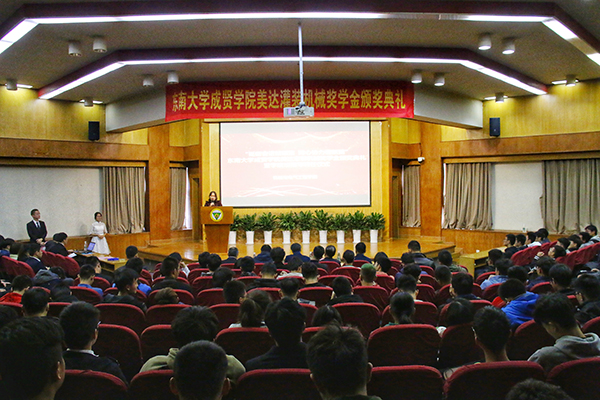 在学校领导的指导和帮助下,在各部门的关心和支持下,机电学院团结拼搏,锐意进取,各项事业稳步前进,彰显了争先创优的良好风尚,涌现出了一批先进个人和先进集体。2018年9月,美达灌装机械有限公司在国产视频 设立了企业奖学金。经过前期严格评审,20名同学脱颖而出,获得“美达灌装机械”奖学金。彭山宏先生给获奖同学颁奖,鼓励同学们铭记“求真求美,成人成贤”的校训,弘扬“止于至善”的东大精神,在实践中锻炼成才,报效祖国、感恩社会。