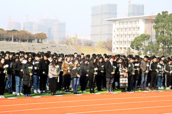 早上七点整,国旗团支部在操场举行了升国旗、降半旗仪式,支部全体成员静默注视并表达对南京大屠杀遇难者的哀悼之情。