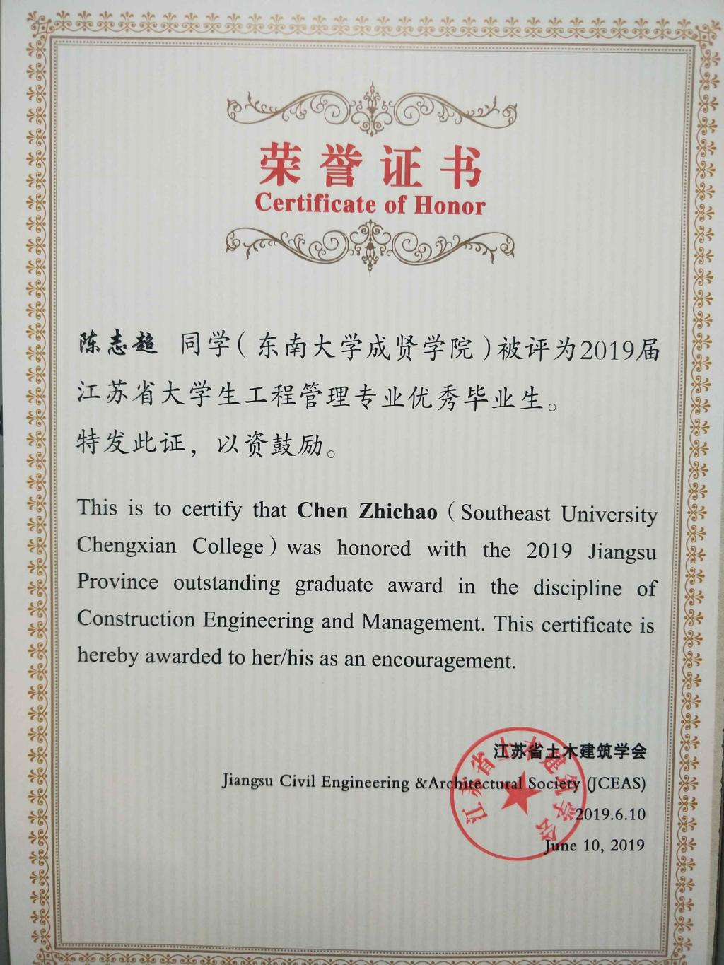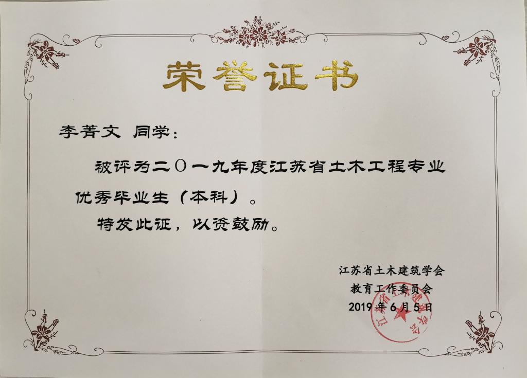 近日,从中国土木工程学会教育工作委员会江苏分会和江苏省土木建筑学会传来喜讯,国产视频 土木与交通工程学院2019届毕业生李菁文荣获江苏省土木工程专业优秀毕业生,陈志超荣获江苏省工程管理专业优秀毕业生。