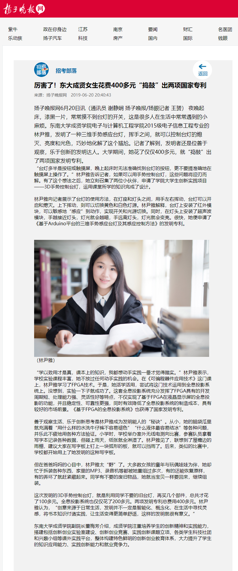 【扬子晚报】厉害了!东大成贤女生花费400多元“捣鼓”出两项国家专利