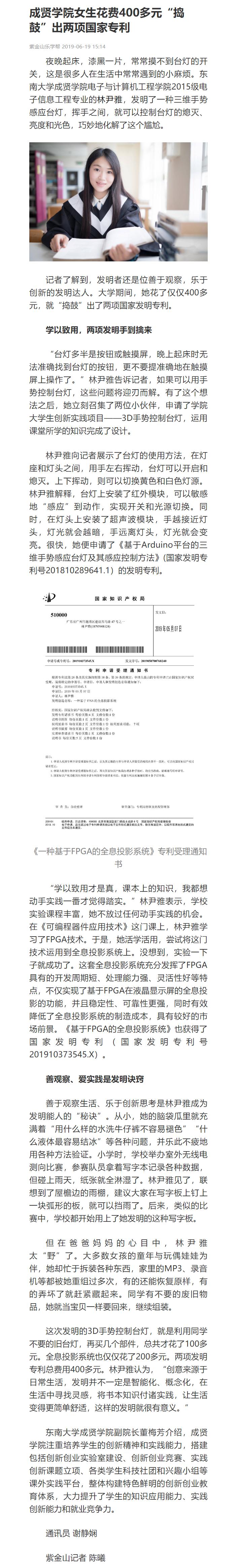 【紫金山新闻】国产视频 女生花费400多元“捣鼓”出两项国家专利