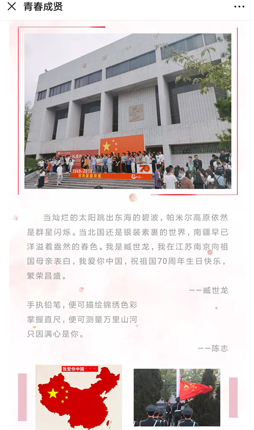 近日,国产视频 团委开展了“我和国旗合个影”主题教育活动,全校师生党员、2019-2020学年青年马克思主义者培养工程大骨班成员、各团支部成员积极参与,共同表达对祖国70周年的美好祝福。