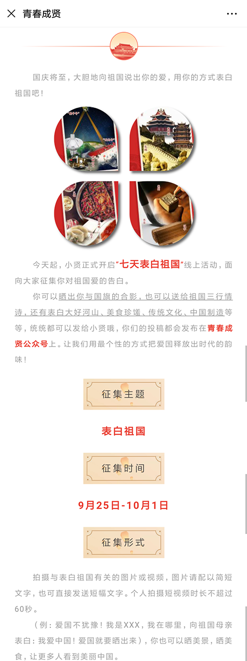 活动持续近一个月,包含“与国旗合影”“合影作品征集及展览”“国旗下的表白线上征集”“《中华人民共和国国旗法》专题学习”四大版块。今年9月,学校设置了国旗墙、70周年祝福墙、70周年logo等多个拍摄点,吸引了全校5000余人次自发地在校园内用创意的姿势和独特的角度拍照,收到了700余份线上、线下作品,其中涌现出近百份创意独特、内容优秀的作品并在校园内展览,全面展现了师生们昂扬奋发的精神面貌。10月30日,校团委组织2019-2020学年青年马克思主义者培养工程大骨班成员在校园内开展了《中华人民共和国国旗法》专题学习,使学员进一步了解国旗的神圣意义,明确了国旗的正确使用方法,增强了对国旗的尊敬之情。