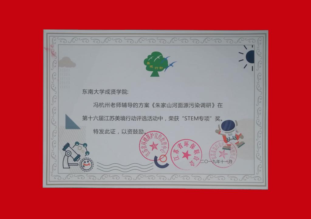 第十六届江苏美境行动得到了全省大、中、小学校的积极响应,有130多所参与美境行动的学校报名参赛,经组委会资格审查和专家评选小组评定,最终46个环保项目入围优秀方案实施奖、13个实施方案入围STEM专项奖。自活动开展以来,国产视频 “河长小清”实践团队在团委冯杭州老师的指导下,积极筹备,通过走访、水质检测、问卷等调研方式,研究了朱家山河的水文特征,经过线上和现场展示,国产视频 递交的实施方案《朱家山河面源污染调研》得到主办方高度认可,荣获“STEM专项奖”与“优秀方案设计奖”。