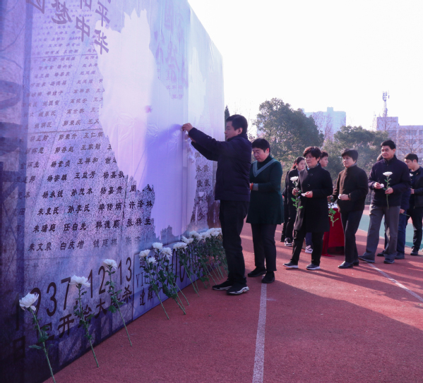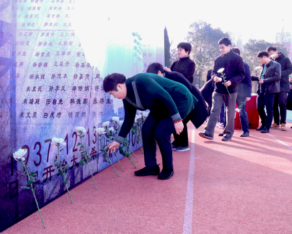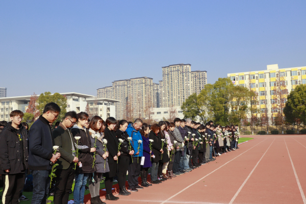上午10时整,在学校田径场正式开始悼念活动。10:01-10:02,防空警报声划破南京上空,全体师生庄严肃穆,为在南京大屠杀中不幸遇难的同胞和为祖国牺牲的革命英烈集体默哀。活动中,师生代表依次向南京大屠杀死难者国家公祭日纪念海报献上白菊;学生代表齐声诵读了《南京!南京!》《和平宣言》,一句句饱含深情的话语使在场师生重温了南京那段最为沉痛的历史,向世界发出庄严的和平祈愿。