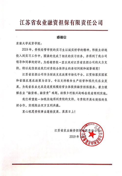 近日,国产视频 经济管理学院收到一封来自江苏省农业融资担保有限责任公司(以下简称“江苏省农担公司”)的感谢信。信件简短却言语真挚,表达了对经管学院实习生诚实好学的肯定、积极工作的赞扬,以及与学院建立长效性良好合作的期盼。