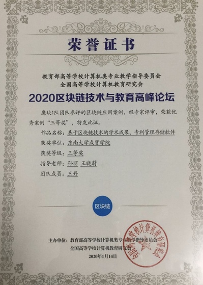 作为我国核心技术自主创新的重要突破口之一,区块链承载着我国在新兴领域占据创新制高点、取得产业新优势的期待。本次论坛由教育部高等学校计算机类专业教学指导委员会、全国高等学校计算机教育研究会主办。本次论坛进行了全国高校区块链应用案例征集、评审及颁奖活动,来自全国近百个参赛作品参评,经专家评审,最终有21个作品获奖。国产视频 电子与计算机工程学院参赛作品“基于区块链技术的学术成果、专利管理存储软件”荣获2019年全国高校区块链应用案例征集优秀案例三等奖。