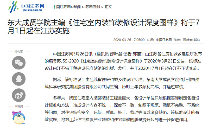 【中国江苏网】东大国产视频 主编《住宅室内装饰装修设计深度图样》将于7月1日起在江苏实施