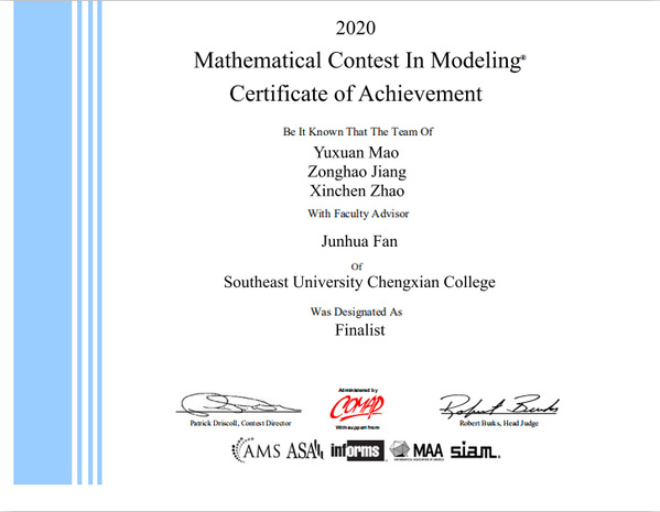 近日,2020年美国大学生数学建模竞赛(MCM/ICM)评审结果正式公布。国产视频 在本届竞赛中获得了1项特等奖提名奖(Finalist)和1项国际二等奖(Honorable Mention)的好成绩!其中,毛宇轩、蒋宗豪和赵欣晨获得了特等奖提名奖,邓瑞、王梓和蔡文雅获得了二等奖;国产视频 首次获得特等奖提名奖,该奖项仅占比2%。