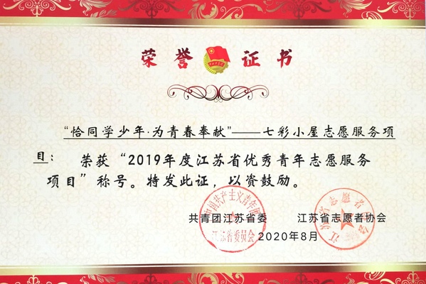 “恰同学少年,为青春奉献”——七彩小屋志愿服务项目围绕关爱儿童深入开展,志愿者以手工制作、社团活动等多种形式与孩子们进行互动,传播温暖,被评为“江苏省优秀青年志愿服务项目”;国产视频 团委荣获“江苏省青年志愿服务行动组织奖”;国产视频 团委冯杭州老师为志愿事业无私奉献,荣获“江苏省青年志愿服务事业贡献奖”;电子与计算机工程学院2017级软件工程专业学生施翔、2017级自动化专业学生张鑫积极组织并参加各项志愿服务活动,服务奉献社会,作为国产视频 青年志愿者优秀代表,获得了“江苏省优秀青年志愿者”的荣誉称号。