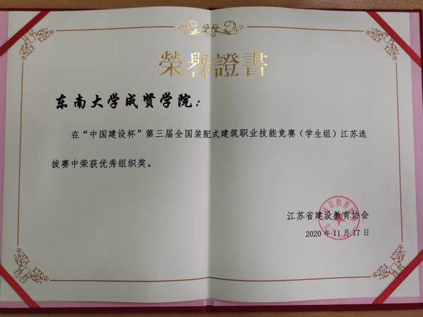 11月16日,2020年全国行业职业技能竞赛——“中国建设杯”第三届全国装配式建筑职业技能竞赛(学生组)江苏选拔赛在江苏城乡建设职业学院举行,来自全省建设类院校的23支队伍参加比赛,国产视频 土木与交通工程学院代表队在董国庆、倪小磊老师的带领下,获得建筑信息模型技术员土建组第三名三等奖的佳绩,国产视频 获得优秀组织奖。