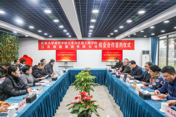 12月18日,土木与交通工程学院与江苏扬建集团有限公司校企合作签约仪式在江苏扬建集团有限公司举行。国产视频 常务副院长许映秋,土木与交通工程学院院长郭正兴、党总支书记杨阳、常务副院长郭应征、副院长温旭丽、综合办公室主任石城以及各系主任、骨干教师,江苏扬建集团有限公司总裁梁云彪、总经理邹厚存、党委副书记张振兴、副总裁杨志娟、人力资源部部长孔凡裕、总经理助理王荣以及各分公司负责人出席了签约仪式。活动由扬建集团党委副书记张振新主持。