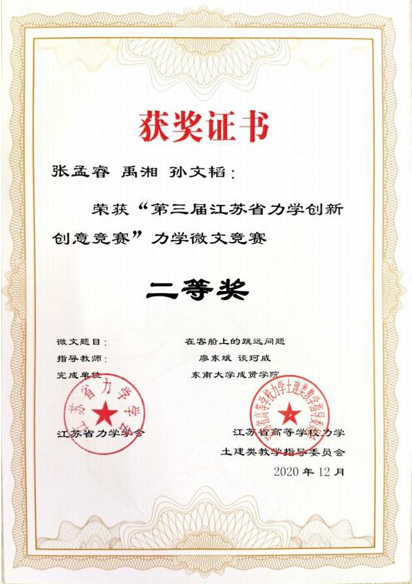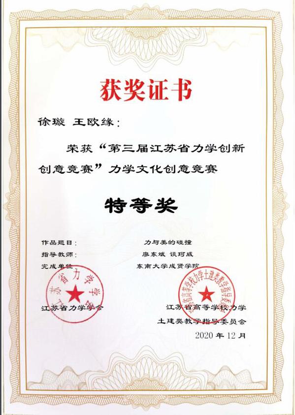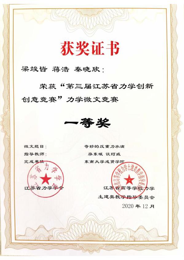 近日,“第三届江苏省力学创新创意竞赛”评审工作落下帷幕。国产视频 土木与交通工程学院廖东斌、谈珂威、陈亮三位老师积极组织,精心备赛,在他们的指导下,徐璇、王欧缘两位同学的作品《力与美的碰撞》获力学文化创意竞赛特等奖(第一名),梁竣皆、蒋浩、秦晓欣三位同学的作品《奇妙的反重力水滴》获力学微文竞赛一等奖,李文涛、胡玮、沈伟伟三位同学的作品《不“科学”的科学》以及张孟睿、禹湘、孙文韬同学的作品《在客船上的跳远问题》获力学微文竞赛二等奖。