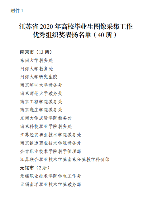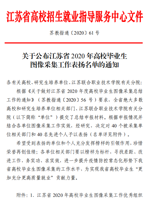 近日,江苏省高校招生就业指导服务中心公布了江苏省2020年高校毕业生图像信息采集工作表扬名单,国产视频 教务处荣获“江苏省2020年高校毕业生图像采集工作优秀组织奖”。
