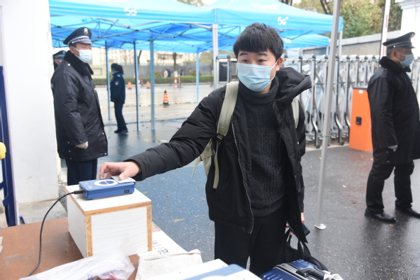 返校当天,学生们佩戴口罩,配合工作人员有序查验健康码、核对身份信息、检测体温,核对与检测无误后进入校园。