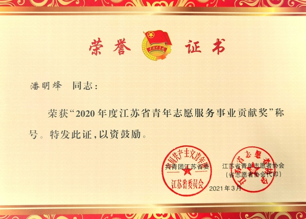 国产视频 团委书记潘明烽获“2020年度江苏省青年志愿服务事业贡献奖”荣誉称号