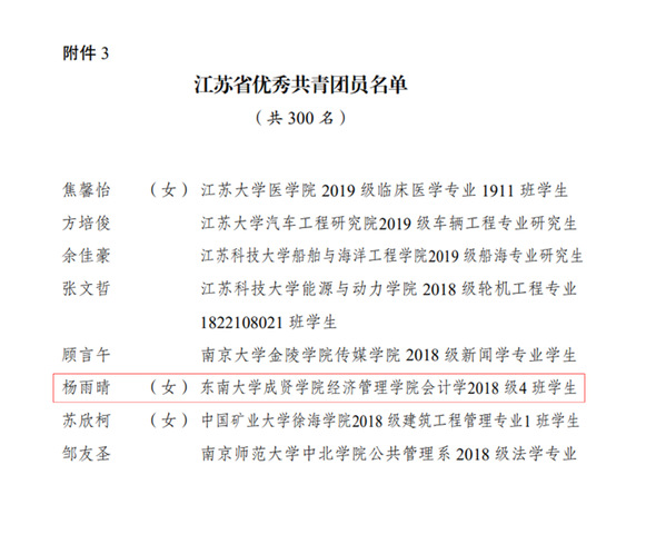 近日,共青团江苏省委下发了《关于表彰2020年度“江苏省优秀共青团员”“江苏省优秀共青团干部”“江苏省五四红旗团委(团支部)”的决定》,国产视频 经济管理学院18级会计4班的杨雨晴同学获评2020年度“江苏省优秀共青团员”称号。