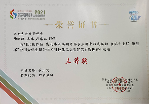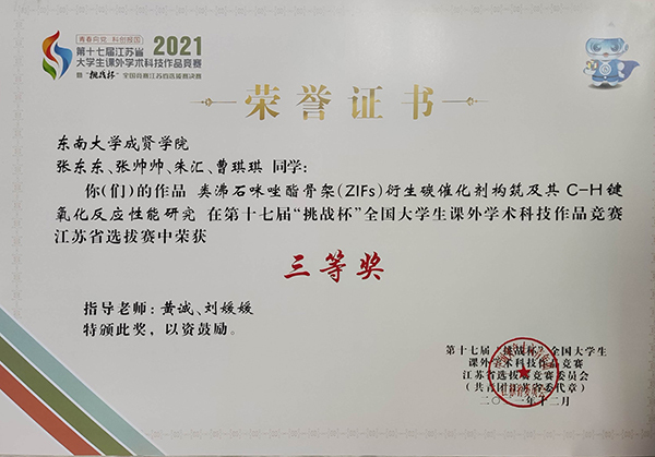 自初赛以来,学校领导高度重视,由校团委联合教务处、各学院分团委组织“挑战杯”竞赛项目的选拔工作,经过各院的认真准备,校赛共收到9个项目申报,各院教学副院长、专业老师对项目指导亲力亲为,经过精心打磨和修改,最终遴选4个项目参加省赛。决赛采用“作品陈述+评委问辩”的方式进行,经过审阅材料、现场问辩、分组评论等环节,在指导老师和成员的共同努力下,制药与化学工程学院副院长刘媛媛指导的《萘酰亚胺-哌嗪类固相传感器的制备及性能研究》获省赛二等奖,制药与化学工程学院黄诚老师指导的《类沸石咪唑酯骨架(ZIFs)衍生碳催化剂构筑及其 C-H键氧化反应性能研究》和土木与交通工程学院董开发与刘美景老师指导的《某大跨网架钢结构多点同步卸载模拟》获省赛三等奖。本次挑战杯带来的不仅仅是创新思维和科研素养,更重要的是在建党100周年之际,参加挑战杯的过程就是践行新时代青年学生的初心和使命。