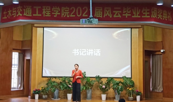 典礼在青春洋溢的舞蹈《天天向上》中拉开了帷幕,随后进行了土木与交通工程学院2021届“风云毕业生”颁奖活动。活动表彰了在校四年来在学术科研、创新创业、公益实践、文艺体育等德、智、体、美各方面均取得优异成绩的2021届毕业生,最终共有33名毕业生分别获得金坛明德奖、华馆鼎新奖、体艺双馨奖、文昌知书奖、桃园惟馨奖和土木风云奖共计六个奖项。颁奖过程中,获奖同学丰富而精彩的个人事迹获得了在场观众热烈的掌声和由衷的赞叹。