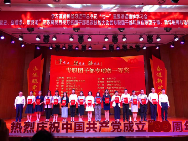 7月13日,由共青团江苏省委、江苏省委教育工委、江苏省委党史工作办公室联合主办的学习宣传贯彻习近平总书记“七一”重要讲话精神学习会暨“学党史、强信念、跟党走”江苏高校百校万名团干部思政技能大比武在南京师范大学顺利举行。国产视频 经济管理学院分团委书记苏珍晶荣获“大赛专职团干部专项赛”一等奖,校团委兼职副书记潘天娇荣获“大赛兼挂职团干部专项赛”二等奖的好成绩。