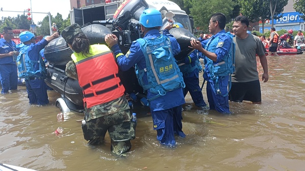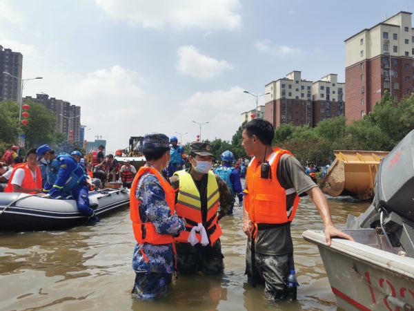 救援中,周广侠、陈鹏举两位同学,不畏艰险,奋不顾身,同救援队成员一起,为抢险救灾工作贡献出自己的全部力量。在抵达卫辉市后,陈鹏举首先领取物资以及救援所必须的冲锋舟,由于积水太深,无法开车前往赈灾中心,全部人抬着冲锋舟,趟着没过膝盖的积水前行,分秒必争。从灾区发来的图片中,其中一张照片让人刻苦铭心——陈鹏举同学从被困住宅楼里抱着一名小女孩走在积水中,他的脸上坚毅而温暖,小女孩的脸上恬静而从容,后方是大片拥挤和紧迫,前方是一片光明与胜利。陈鹏举救援时大部分时间一直浸泡深水区,见到救援行动就冲,与时间赛跑搜救营救、转移被困人员,多日的工作被晒脱皮了,曾经的优秀士兵冲在救灾“战场”,响应号召,践行着敢打敢拼的军人本色。周广侠同学作为一名退伍女兵和中共党员,在受灾现场同样拿出了“巾帼不让须眉”的气势。烈日下、雨水里,坚持背着沉重的作战包,用包里的各种药品、物资以及葡萄糖,救助了许多因中暑或受伤而行动困难的救援队员和群众,救援时间紧急,没时间吃饭就啃泡面面饼,因为或许下一秒,就有新的救援任务。天灾无情人有情,两位学生在灾区奋勇当先,迎难而上,实在累得不行就躺在路边的临时地垫上,沉沉睡去,有新的救援任务时又冲锋在先。