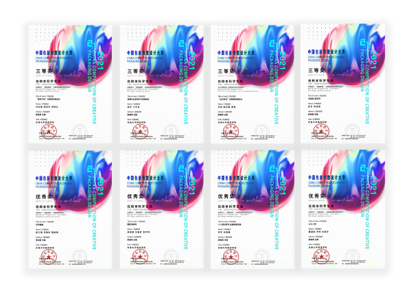 获得全国三等奖的作品:2018级学生凌玲组作品“青春毕业季”果酒系列,在酒瓶的造型与主题上做了符合年轻群体的瓶身创意表现;孙阳组作品“山屿茶记”不仅设计了品牌标志,还在包装结构上做了创新与突破。孙彩霞组作品“独有千秋”将曲线美融入到包装瓶型设计当中、赵引组作品“清”巧妙运用渐变色彩,具有鲜明的辨识度与视觉美感。此外,2018级刘宇组“十二章纹系列”、郑逸菲组“圆折动珠光”,2019级戴健秋组“七十二时”、郁之瑜组“芬芳馥郁”分别获得了全国优秀奖。