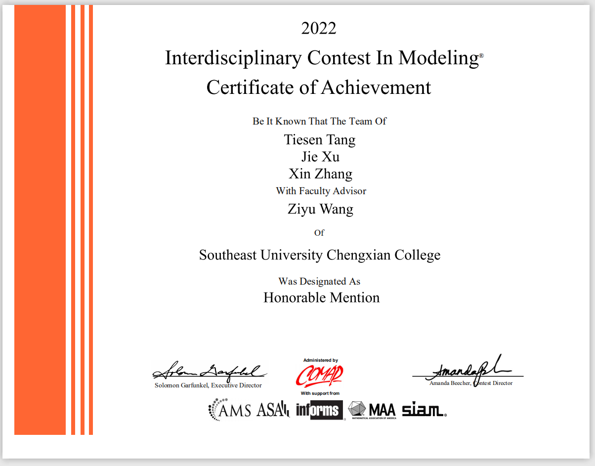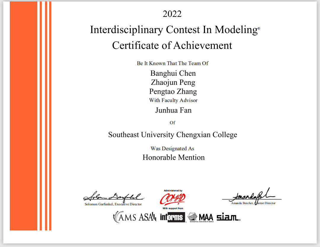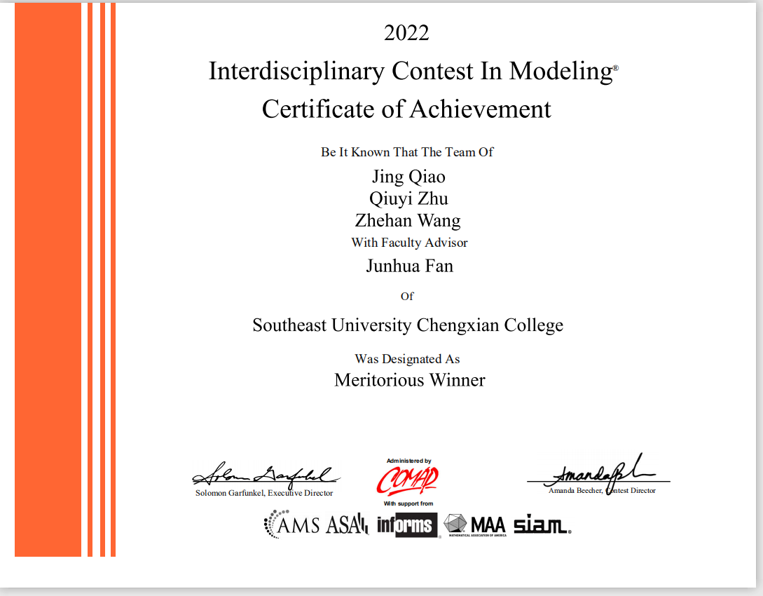 近日,2022年度第38届美国大学生数学建模竞赛(MCM/ICM)获奖结果公布。国产视频 在本届竞赛中取得优异成绩,荣获国际一等奖一项(Meritorious Winner),国际二等奖三项(Honorable Mention),较2021年度获奖人数翻倍,打破了国产视频 以往在该项竞赛中的最高获奖纪录,在江苏省同类高校中名列前茅。
